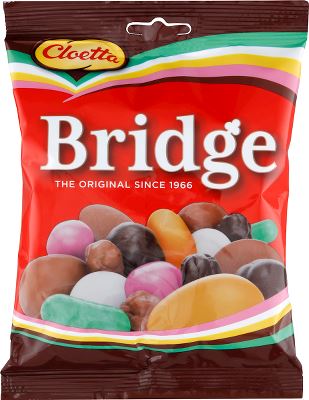 • Cloetta Bridge Mix är en läcker kombination av olika sötsaker i 180g. Mixen innehåller mörk choklad, helmjölk, mandel, vetemjöl, hasselnötter och russin för en unik smakupplevelse. Den innehåller ingen alkohol men har ett näringsvärde på 468 kcal per 100 g. Perfekt för mysiga stunder, särskilt under brädspelstimmarna. Med sin attraktiva förpackningen och den goda smaken passar den både till vardags och till fest.